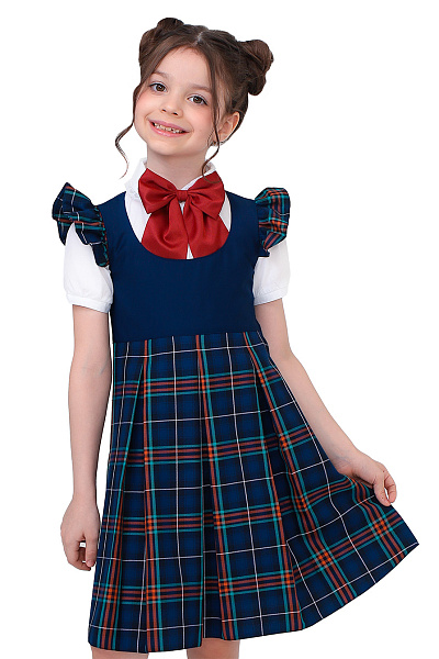 Сарафан легко комбинируется с рубашками и блузками, подходит для уроков и школьных событий.