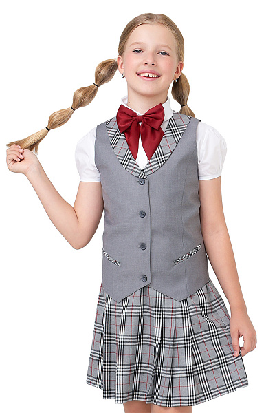 Жилет в серую клетку для девочки выполнен из качественной костюмной ткани, которая хорошо держит форму и долго сохраняет аккуратный вид. Классический крой делает модель универсальной.