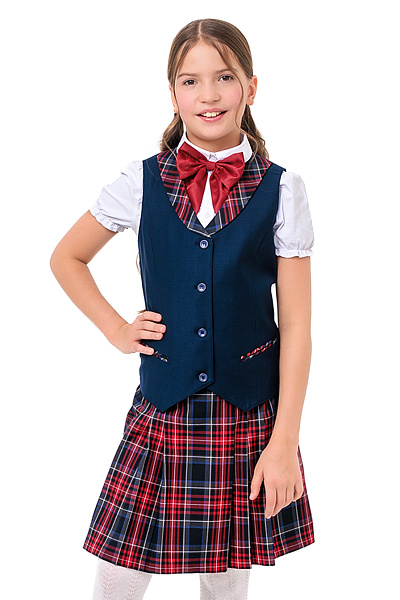 Жилет школьный классический из костюмной ткани для девочки с синим клетчатым рисунком и красными акцентами создан для школьной формы. Плотная ткань хорошо держит форму и приятна на ощупь. Модель украшена двумя контрастными карманами-рамочками, а V-образный вырез с полукруглым лацканом делает посадку аккуратной на груди и плечах.
